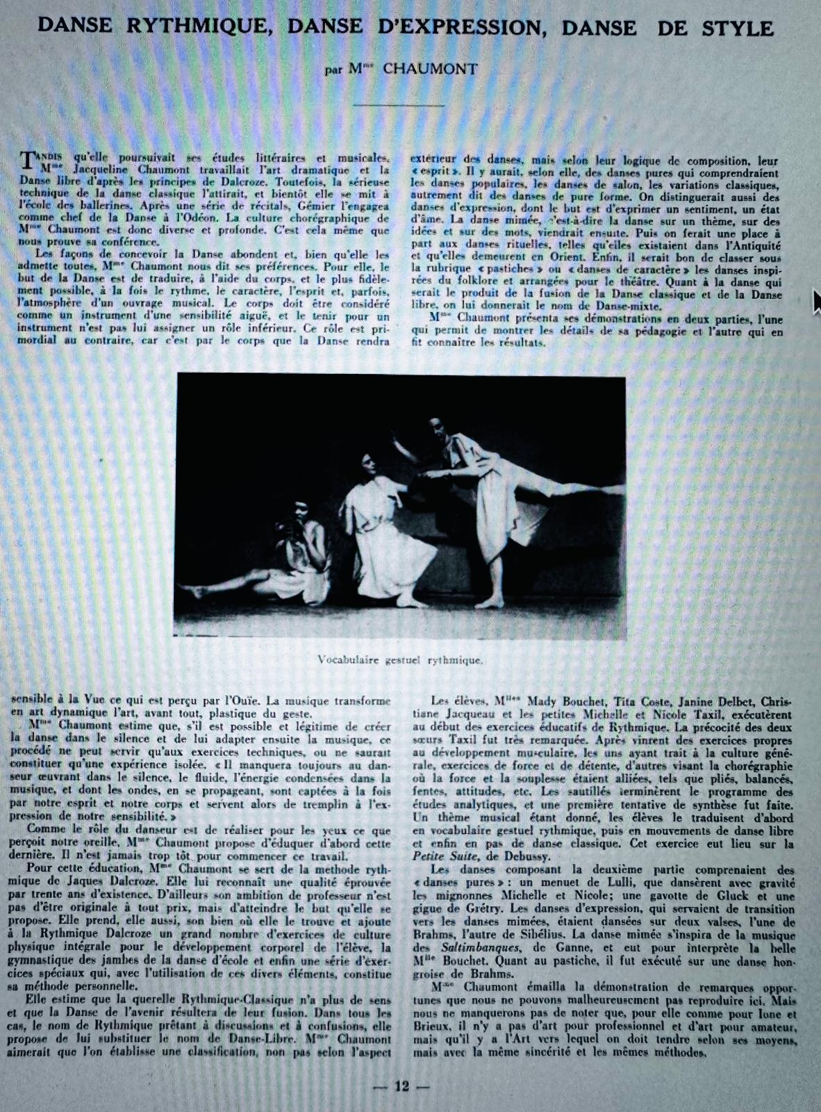 Mme Chaumont présenta ses démonstrations en deux parties, l'une qui permit de montrer les détails de sa pédagogie et l'autre qui en fit connaître les résultats. Les élèves, Mmes Mady Bouchet, Tita Coste, Janine Delbet, Christiane Jacqueau et les petites Michelle et Nicole Taxil, exécutèrent au début des exercices éducatifs de Rythmique. La précocité des deux sœurs Taxil fut très remarquée. Après vinrent des exercices propres au développement musculaire, les uns ayant trait à la culture générale, exercices de force et de détente, d'autres visant la chorégraphie où la force et la souplesse étaient alliées, tels que plies, balancés, fentes, attitudes, etc. Les sautillés terminèrent le programme des études analytiques, et une première tentative de synthèse fut faite.